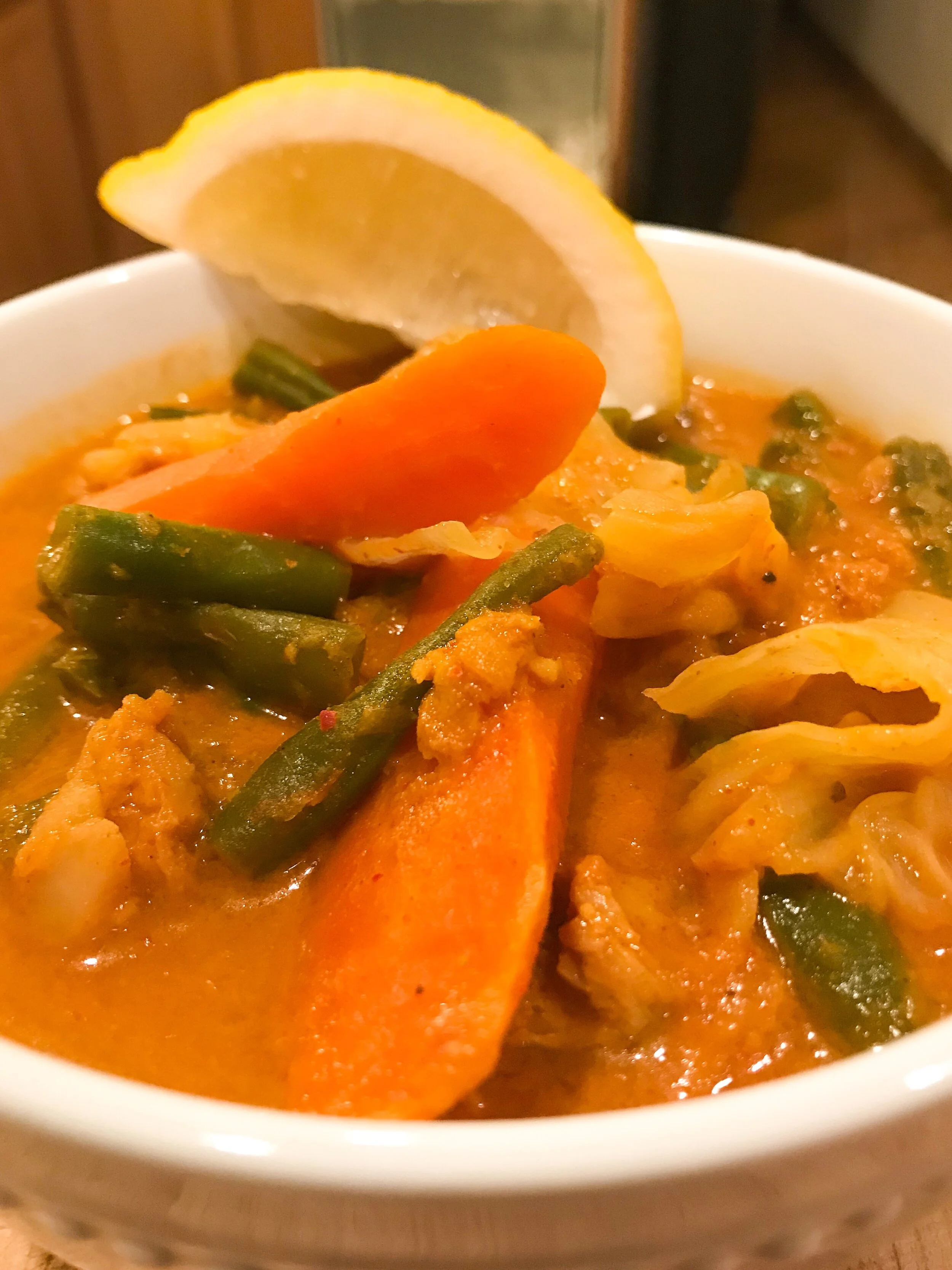Stir in crushed tomatoes. Add green beans, carrots, cabbage, and okra. Pour in enough water to cover 3/4 of the contents in the pot. Add in bay leaves and anise. Bring to a boil, lower heat, cover, and simmer for 20 minutes.