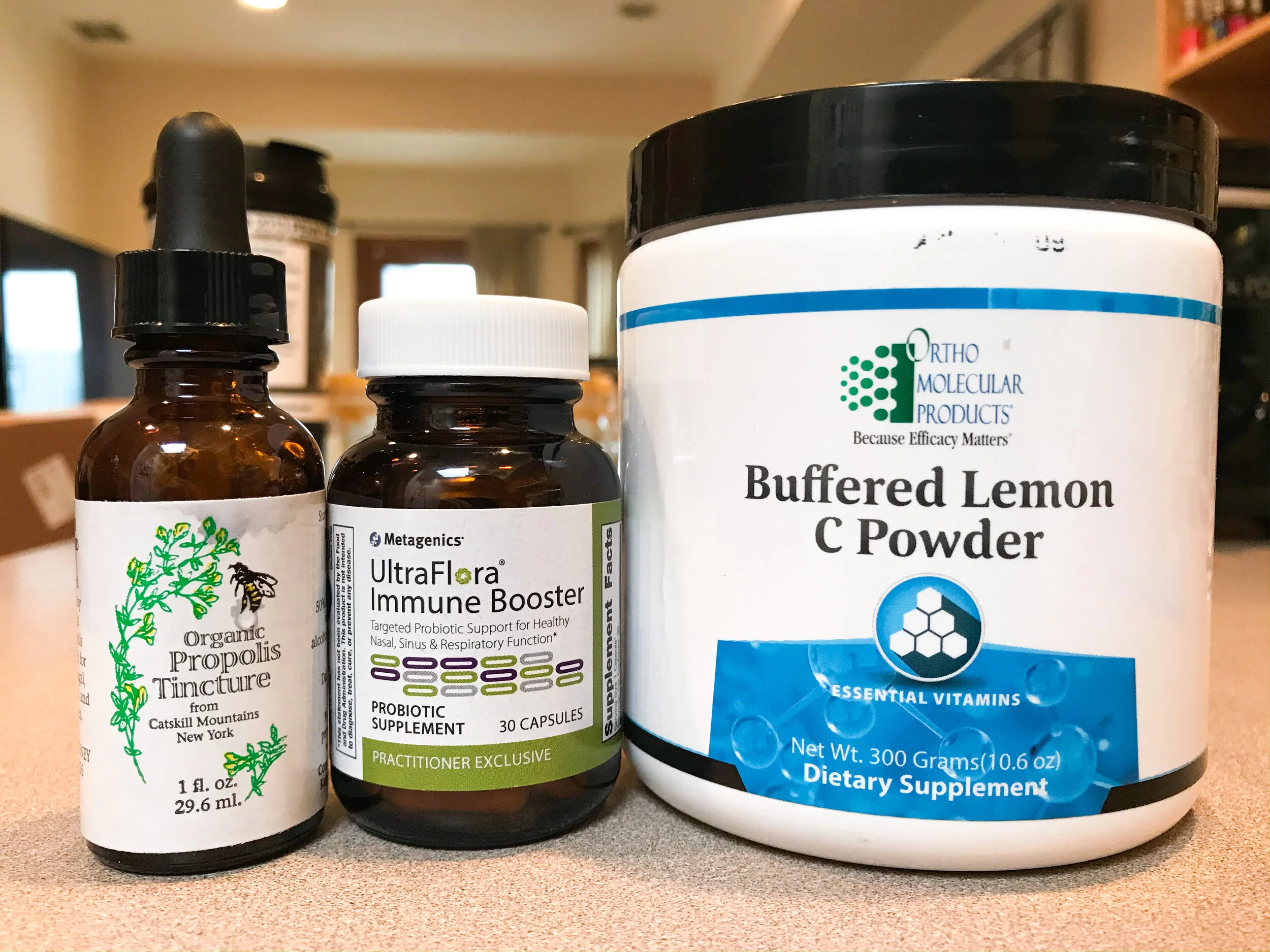 vitamin C - This may not come as a surprise, but vitamin C is crucial for supporting the immune system. This well known nutrient is also a key antioxidant that protects cells from free radical damage, thus boosting the immune system.* While all of this craziness is going on, we're taking 1g twice a day, just to be on the safe side. If you are sensitive to the acidity, opt for the buffered vitamin C like Ortho Molecular's Buffered Lemon C Powder. I like adding this powder to my protein shake in the morning - especially if there are tart fruits like berries in the shake.
